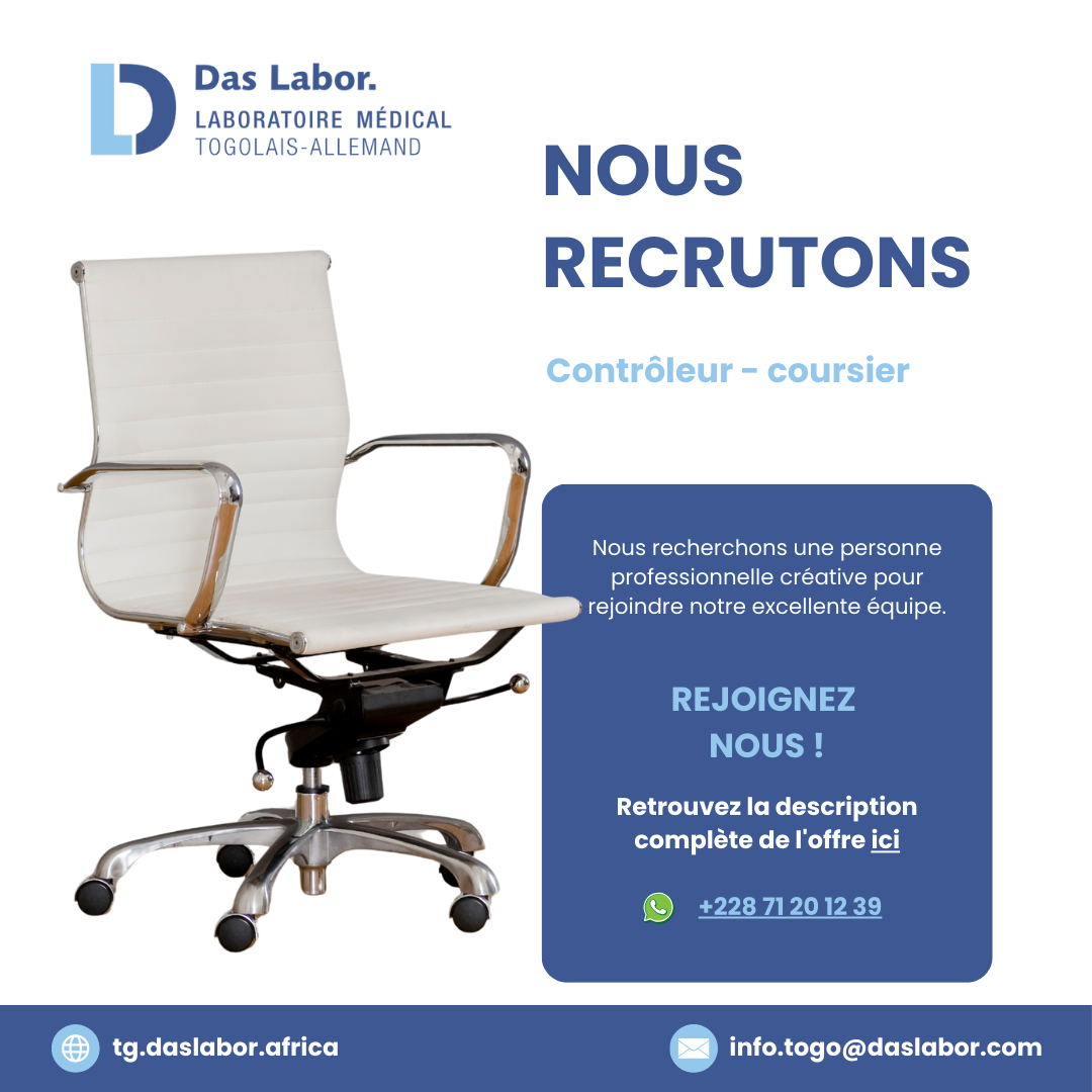 Les dossiers de candidature sont à déposer, sous pli fermé, avec la mention “candidature au poste de Contrôleur-coursier principal” ou “Coursier” au secrétariat de Das Labor Togo SARL sis à Rue des Cygnes (Ancien Siège ANASAP), Quartier Tokoin Habitat, 01 BP 830, Lomé au plus tard le 21 Juillet 2025 à 17H00.